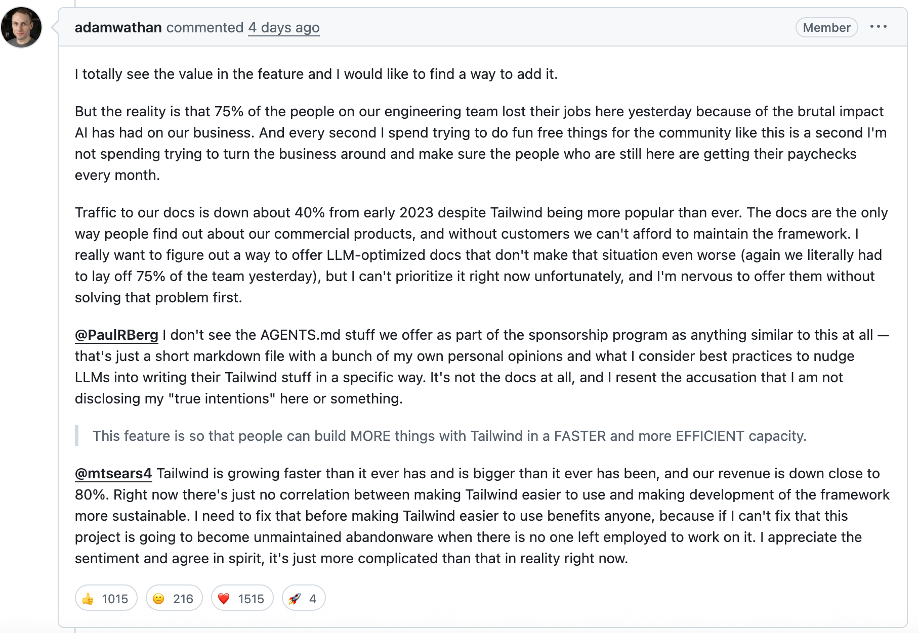 🇬🇧 (33’) Adam Wathan, fundador de Tailwind CSS, comparte en este audio una reflexión muy personal sobre uno de los momentos más duros de su carrera: una crisis financiera prolongada que les ha llevado a despedir a la mayor parte del equipo, replantear el negocio desde cero y asumir que la popularidad del open source ya no garantiza la sostenibilidad.
