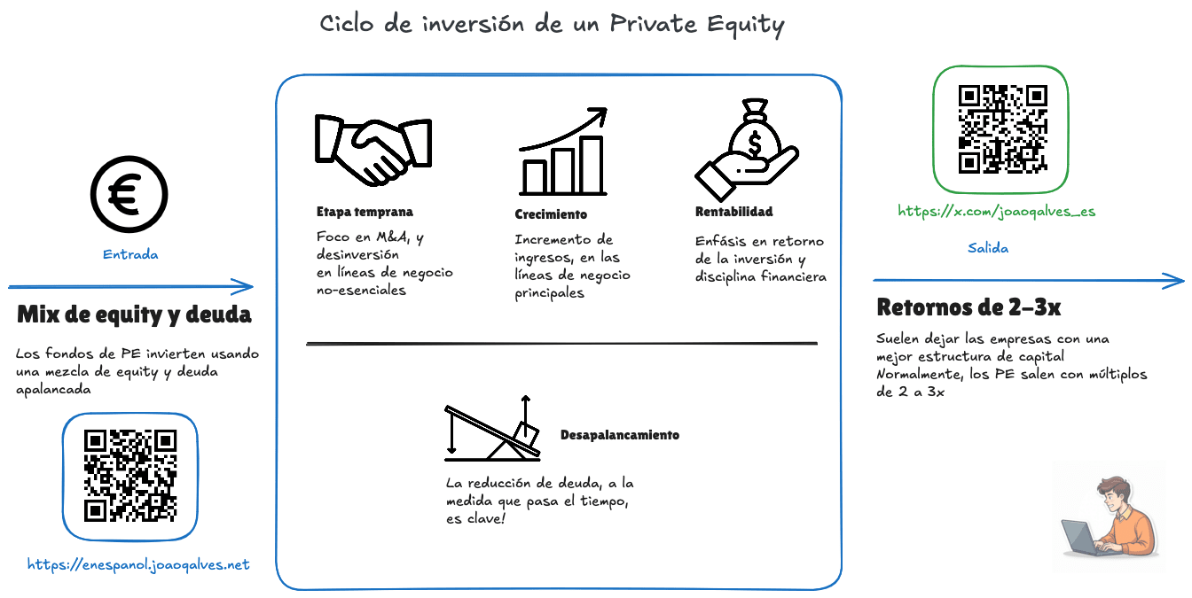 A diferencia del capital de riesgo (venture capital), que invierte en startups jóvenes, el PE se centra en compañías más maduras. Uno de sus métodos más comunes es el Leveraged Buyout (LBO): una operación en la que la mayor parte del dinero proviene de la deuda. Funciona como una hipoteca: el fondo aporta parte del capital y financia el resto mediante un préstamo respaldado por los activos y los flujos de caja futuros del negocio.
